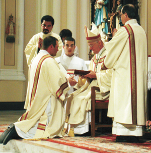Bishop Martin Amos hands the Book of the Gospels to Deacon-elect Jacob Greiner. Deacon Greiner was ordained a transitional deacon during a Mass April 28 at Sacred Heart Cathedral in Davenport.