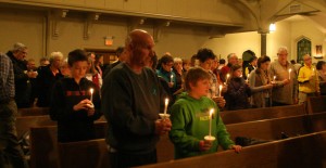 Two altar servers lit tapered candles off the Easter candle and then lit the first candle in each row of the church. Participants lit their neighbors’ candles until the whole church was aglow with light. Deacon Bob Shaw read a Litany of Hope.