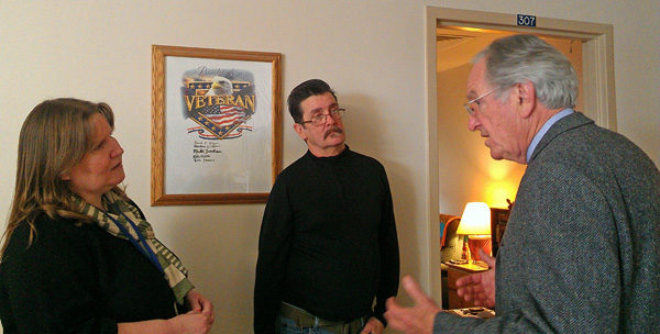 U.S. Sen. Tom Harkin, D-Iowa, talks with Cathy Jordan, lead for the VALOR Program, at Humility of Mary Shelter Inc., Davenport, while Richard, a participant in the veterans transitional housing program, listens. Sen. Harkin toured the shelter Jan. 31.