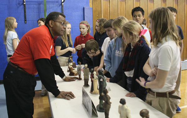 Jim Collins answers questions about African Americans following a presentation at All Saints Catholic School in Davenport Feb. 12. Collins brought a collection of statues that he showed as he talked about various people as part of Black History Month.