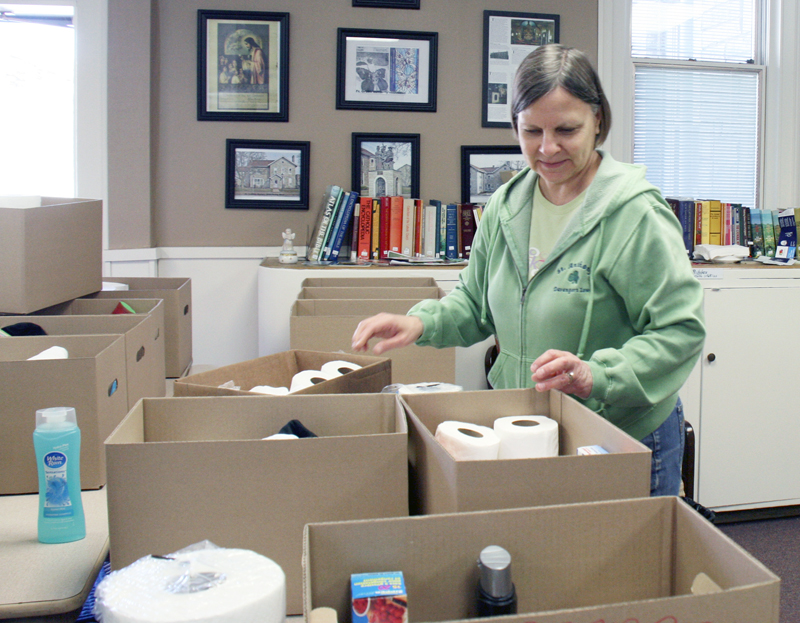 After lunch, the diners were encouraged to step over to the parish library where volunteers distributed 107 boxes of items including toothpaste, toothbrushes, toilet paper, shampoo, socks, T-shirts/undershirts, deodorant and ready-to-eat food items, parishioner Carrie Delcourt said.