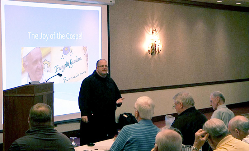 Father Brendan Moss, OSB, talks with priests of the Diocese of Davenport about “The Joy of the Gospel” during the June Institute. The annual conference was held June 2-4 in Iowa City.