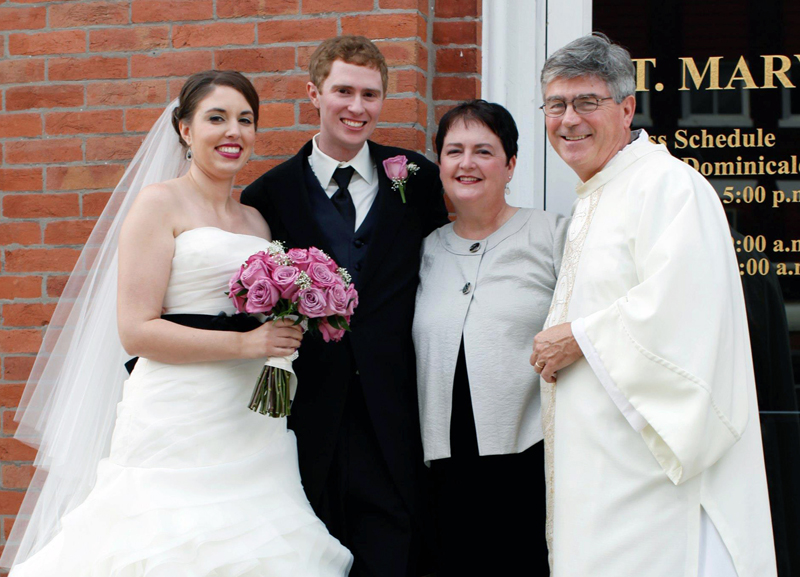 Chris and Lindsay Steele pose outside St. Mary Church in Davenport on their wedding day, Nov. 3, 2012, with Deacon George Strader and his wife Terry