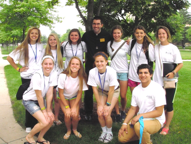 A group of diocesan teenagers pose with speaker Father Pat Reidy at Notre Dame Vision in Indiana this past June.