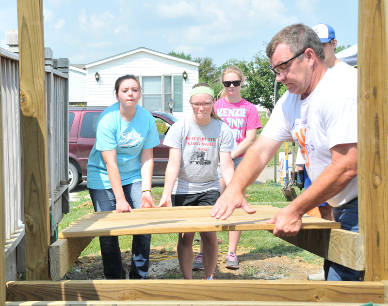 Emma Davis, Jessica Cox and Erin Linnenbrink of St. Mary Parish in Oxford help site coordinator Mike Linnenbrink assemble a wheelchair ramp Aug. 1 in North Liberty. The girls were among seven youths who volunteered last-minute to help assemble the ramp.