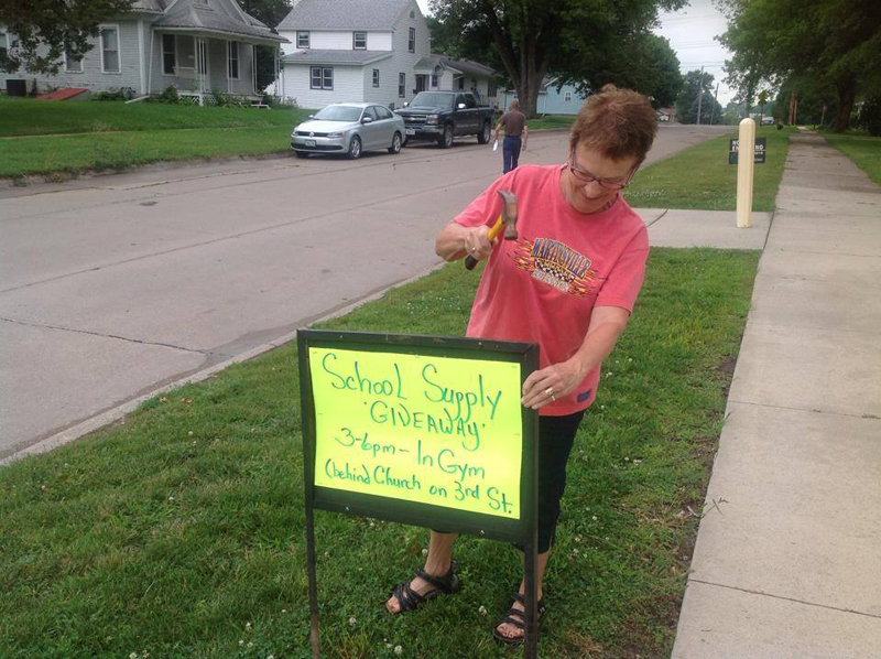 St. James parishioner Pat Dessner posts a sign advertising the community school supply drive, which is hosted by the church annually.