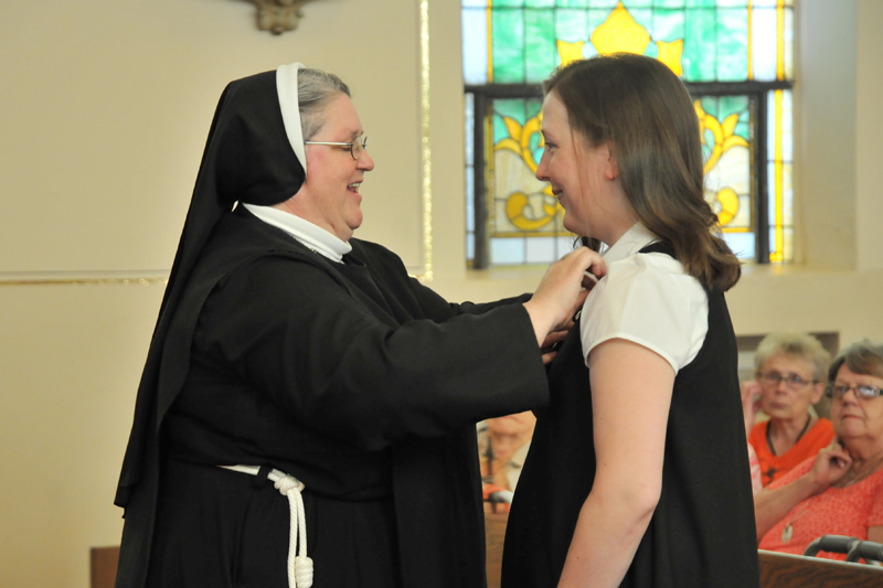 Mother Susan Rueve, OSF, superior of the Franciscan Sisters of Christ the Divine Teacher, places a tau cross around the neck of new postulant Kimberly Karwath, 28, of Bettendorf Aug. 2 at St. Alphonsus Church in Davenport.