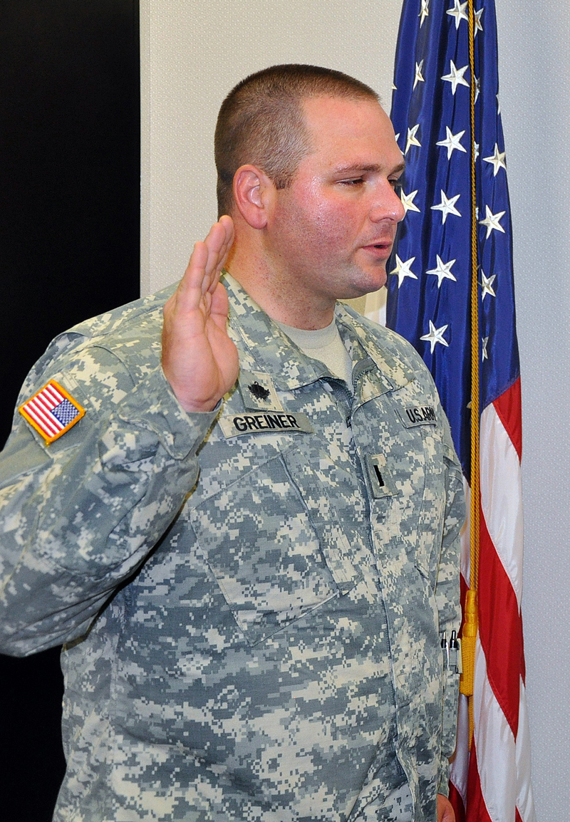 Father Jake Greiner is sworn in and promoted to Iowa Army National Guard captain Aug. 29 at Camp Dodge in Johnston, assuming duties as chaplain.