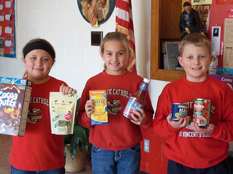 Rachel Hausch, Chloe Ruhl, and Bryor Lindner, fourth-grade students at St. Vincent’s School in Keokuk, pose with food items they’ve donated for the Ladies of Charity Christmas baskets.