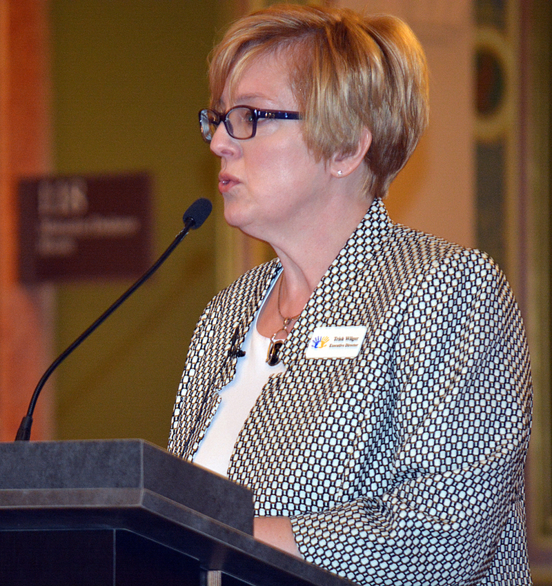 Trish Wilger of Iowa ACE speaks at an Education Savings Account rally in the Iowa State Capitol March 3.