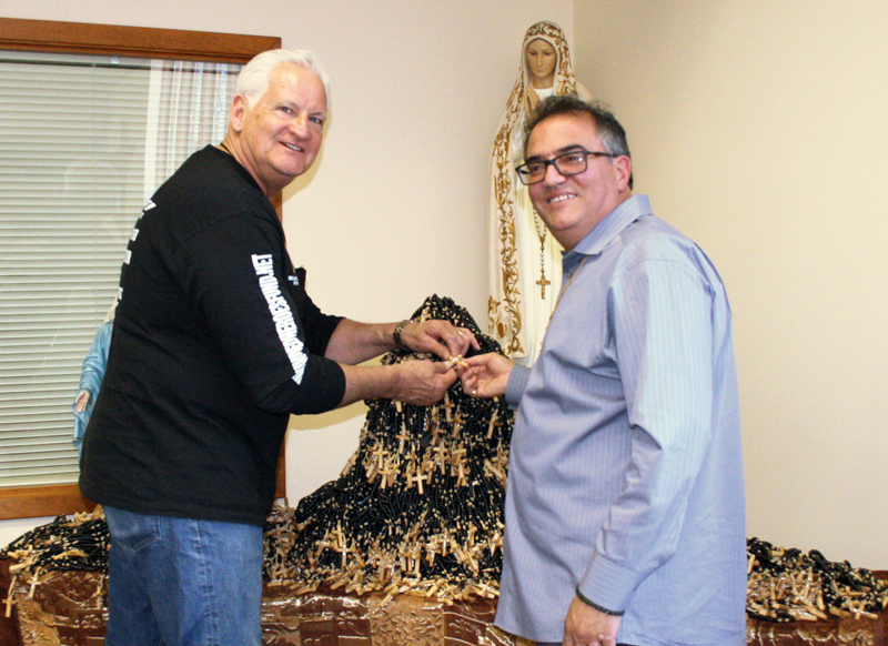 Joe Alger, left, of Lighthouse Catholic Media, and Ghassan Alsahouri of Little Bethlehem Christian Group examine rosaries in Muscatine made for the Holy Land Military Rosary project.