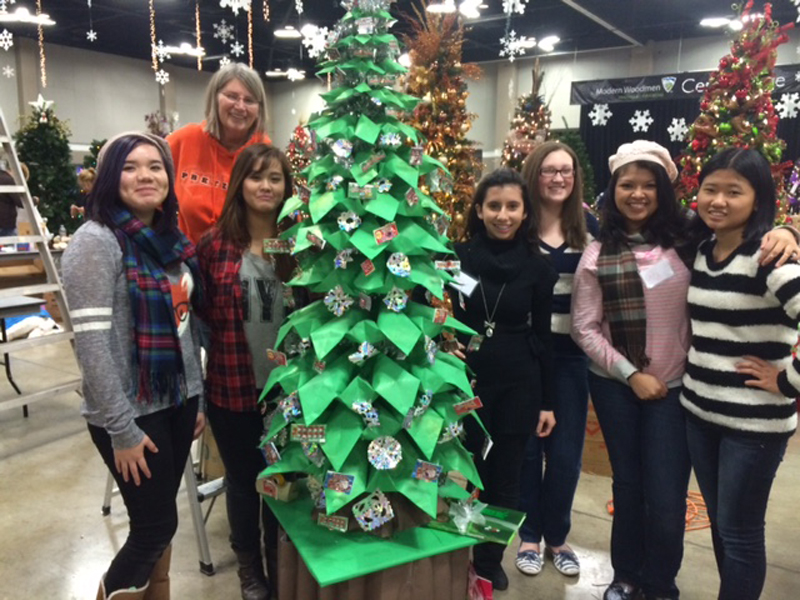 Students from Assumption High School’s Art Club made a Christmas tree out of origami for the annual Festival of Trees event in Davenport last November. From left are Tammy Troung, teacher Holly Secker-Brosman, Caroline Lee, Gabby Moya, Elizabeth Hartsuch, Cindy Chavez and April Huang.