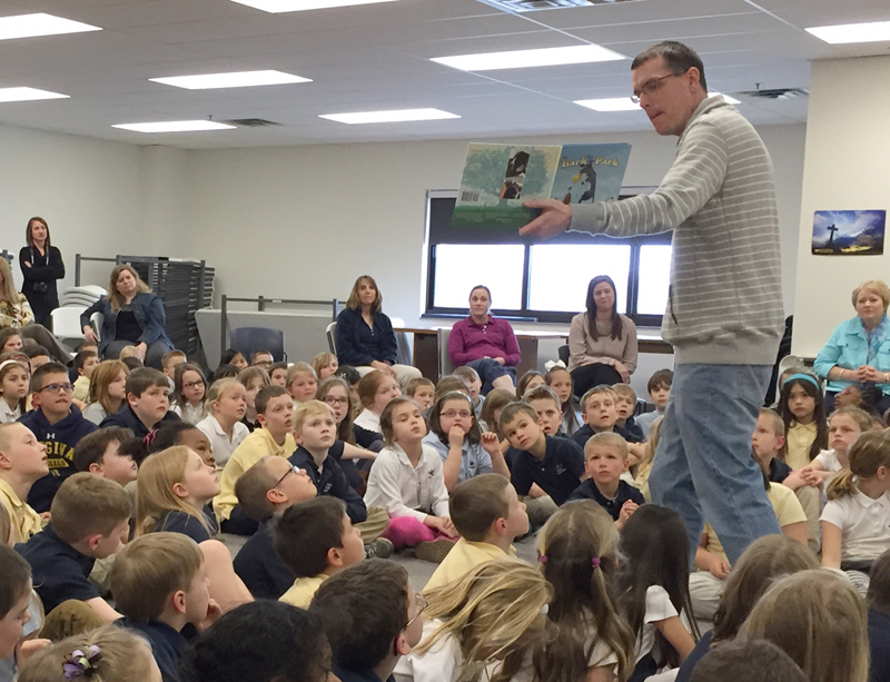 Author and elementary school teacher Andy Allen reads his new book “Stormin’ Norman The Bark in the Park” to students at his alma mater, Regina Catholic Education Center in Iowa City, on March 25.