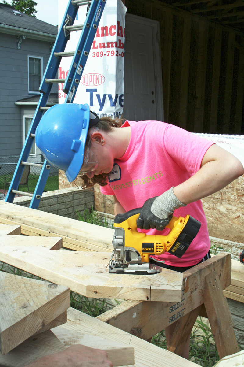 Keeghan Hutchinson uses a jigsaw to cut out a stair template for the Pope Francis house. Parishioners from St. John Vianney Parish in Bettendorf helped with the Habitat for Humanity build July 18 in Davenport.