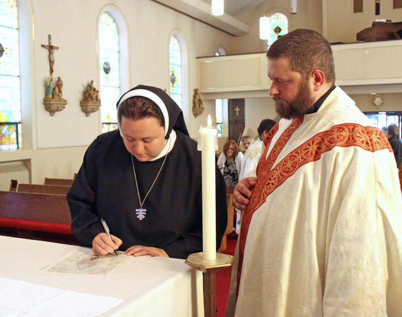 Anne Marie Amacher Sister Seraphin signs a written form of her public profession of the simple vows of poverty, chastity and obedience after taking her first vows for the Franciscan Sisters of Christ the Divine Teacher. Father Paul Appel celebrated the Mass on Aug. 15 at St. Alphonsus Church in Davenport.