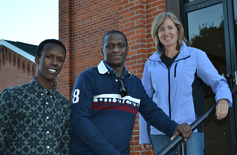 Julie Marner, right, poses for a picture with Burundian English teacher Fabrice Bizimana, left, and Burundi Friends International board member Thierry Yungenge at St. Joseph Parish in Hills last month.