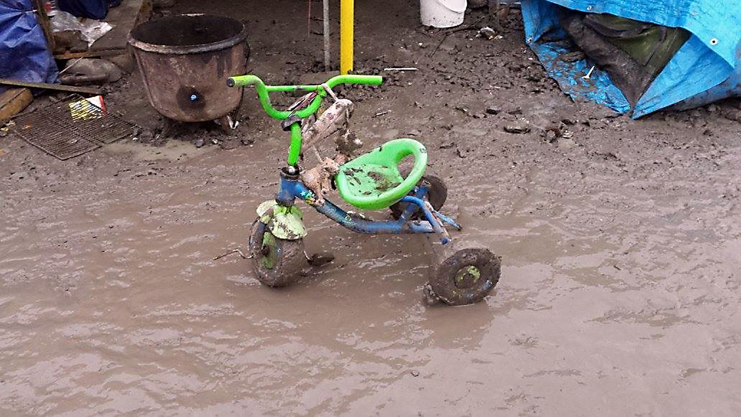 A child’s tricycle is caked in mud at The Jungle refugee camp. Mud – a mixture of soil and human waste – is a common occurrence at the camp.