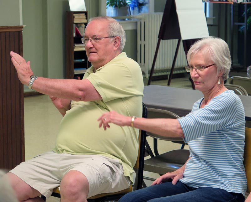 On July 11, the seventh-week of Holy Family’s program, 12 area parishioners participated. After a review of week six, the group moved to chairs set in a circle and sat down. They began with deep breaths and did seated exercises. Marttila and Oldfield-Carlson took turns saying and demonstrating each movement and why that movement was important. Participants moved to standing exercises and back to seated exercises.