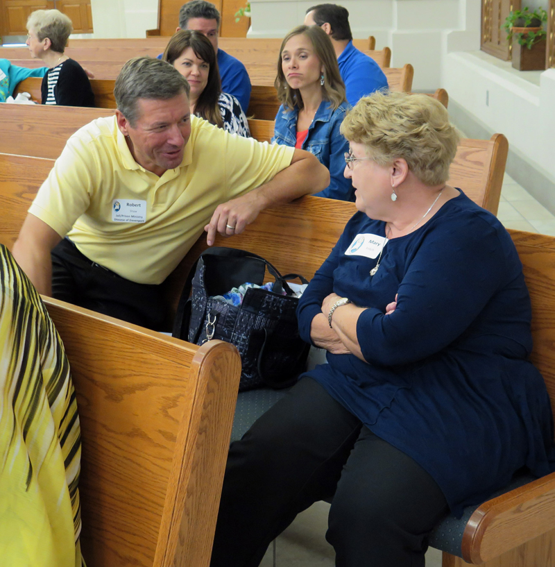 Deacon Bob Shaw and Mary Fritch discuss traits of a person of mercy during the Mercy in Motion — A Ministries of Mercy Conference July 30 at St. Ambrose University. The event was sponsored by the Diocese of Davenport.