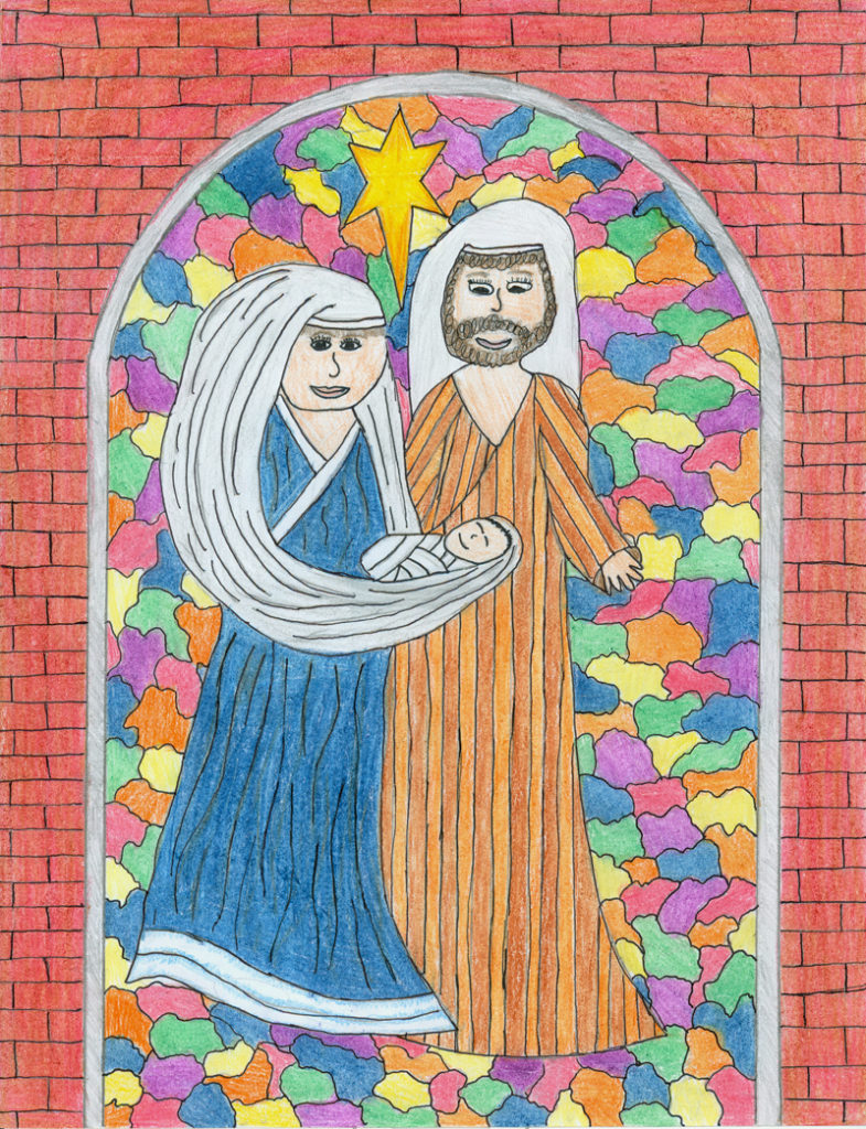 Of course, she knew she wanted the focus to be on the Holy Family. Since she loves the stained glass at church, she decided to surround the family with colorful stained glass. While the church building is more of a brown brick, she chose red brick for her artwork because it is more traditional.