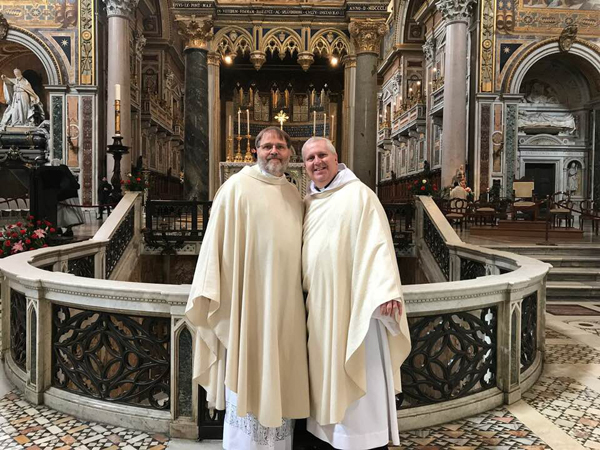 Fathers David Brownfield, left, and Marty Goetz, pose inside St. Peter’s Basilica at the Vatican last month. The two priests were in Rome for a Missionaries of Mercy conference.