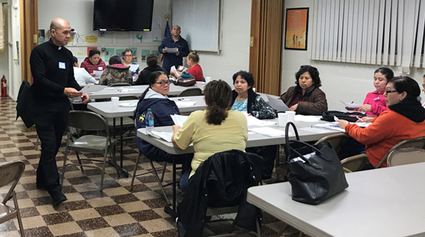 Father Joseph Sia, left, facilitates a Vision 20/20 listening session Nov. 6 at St. Joseph Parish in Columbus Junction. Also shown, in back, is Miguel Moreno, diocesan coordinator of Multicultural Ministry.