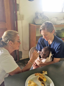 Kathleen Argo and Angela Schmieder feed infant Mirlande during a ServeHAITI mission trip.