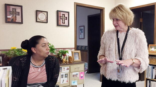 Shelby Newberry, especialista en asociación con la Oficina del Censo de los Estados Unidos del Departamento de Comercio, habló sobre los esfuerzos de promoción del Censo con Esmeralda Guerrero, asistente administrativa en la Oficina de Acción Social de la Diócesis de Davenport.
