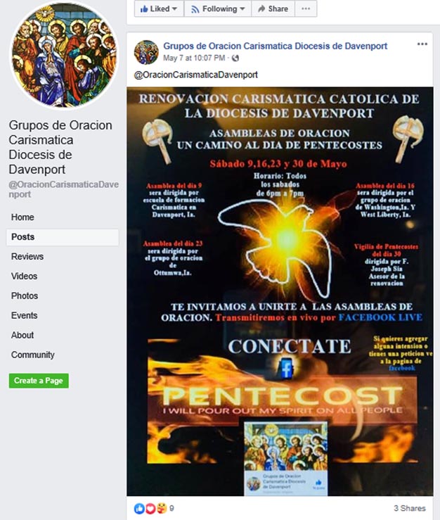 They created a Facebook page as the meeting place for their virtual community, called Grupos de Oracion Carismatica Diocesis de Davenport. Watch their livestreamed and recorded prayer services on Facebook at this link: facebook.com/OracionCarismaticaDavenport/