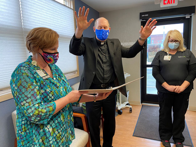 She and Norris described the challenges affecting their patients, particularly during the ongoing COVID-19 pandemic, and stressed that the addiction is a medical condition and not lack of personal initiative. Norris told the bishop about a woman whose VA survivor benefits would have required travel to Des Moines for treatment, an impossibility for her. The diocesan grant allowed her to receive treatment at MercyOne Clinton’s MAT clinic. “That’s terrific,” the bishop responded.