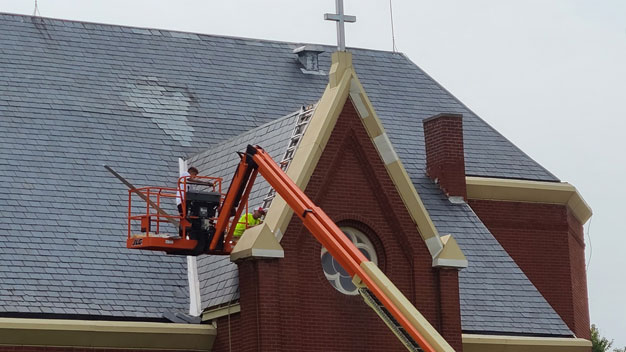 Beckwith Commercial Roofing repairs the derecho-damaged roof of the Catholic Historical Center at St. Boniface in Clinton earlier this month.