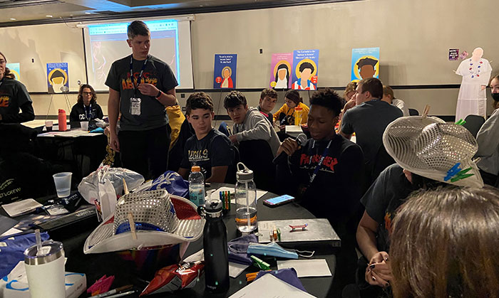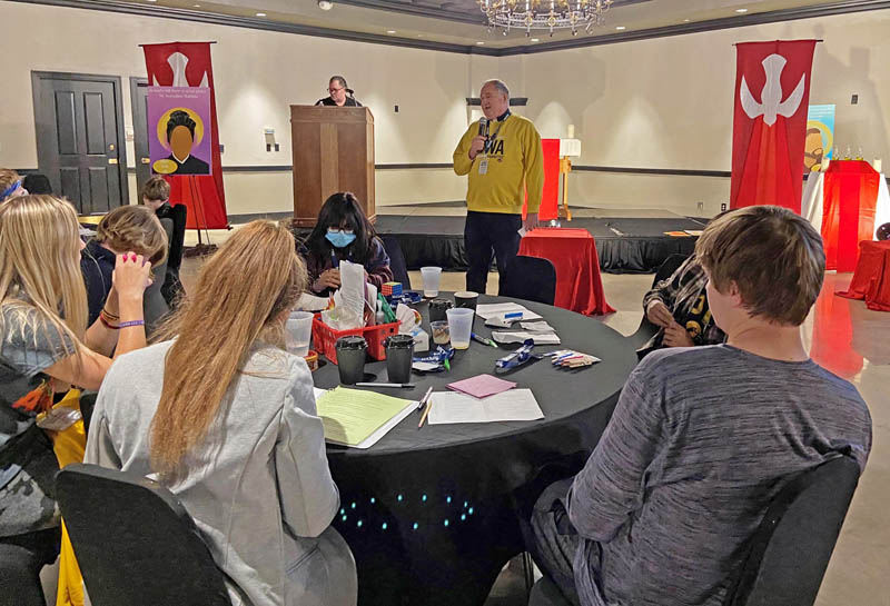 About 130 youths participated, some of them staying overnight at the hotel and others commuting. “So far, it’s been wonderful,” Montgomery said mid-afternoon of the event’s second day as youths chatted and ate snacks during a break. Colorful posters of recognizable saints decorated the banquet room, along with a life-size cardboard Pope Francis, perfect for selfies with new and old friends. Participants were grouped by a saint’s name they wore on their nametags.