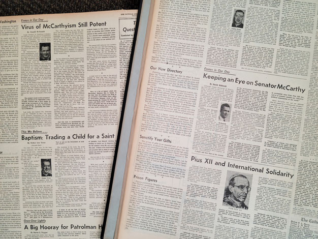 Pictured are two columns on McCarthyism written by Donald McDonald in The Catholic Messenger in the 1950s.