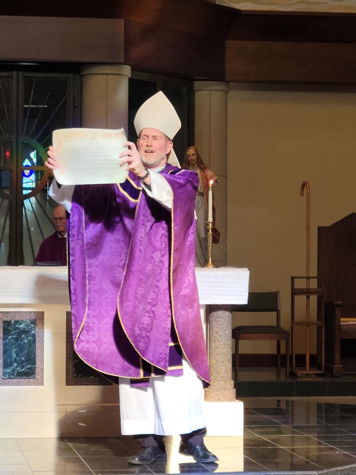 Bishop Thomas Zinkula shows a decree for St. Patrick Parish in Iowa City at the end of Mass Nov. 28. The decree was written in Latin.