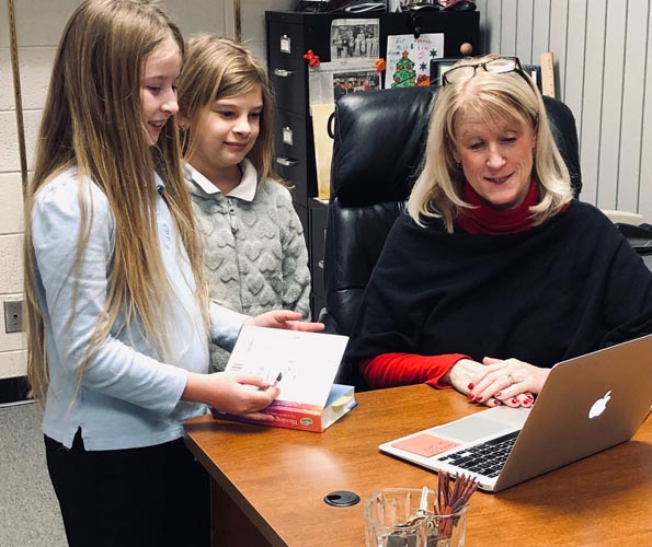 Principal Shari Bozorgzad reviews some papers with fifth-graders Kaitlyn Magliari and Hannah Rippenkroeger.