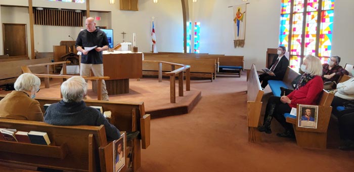 The prayer service at St. Alban Episcopal Church opened with Pastor Kerry Jennings’ call to prayer. Jane Campagna led the reading of psalms and the Canticle of Simeon. The gathering sang “The Cry of the Poor” while watching a video about human trafficking.