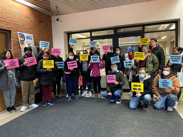 Excluded and essential workers in Scott County pose with signs in the entry of the Scott County Administrative Center in Davenport on Feb. 17, just before the start of a meeting of the Scott County Board of Supervisors. The workers asked the board to provide federal pandemic relief funds to workers excluded from previous rounds of pandemic relief funds.