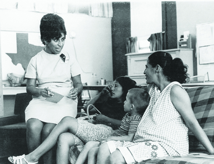 Hna. Irene Muñoz, CHM, habla con una familia migrante en Muscatine a finales de 1960.