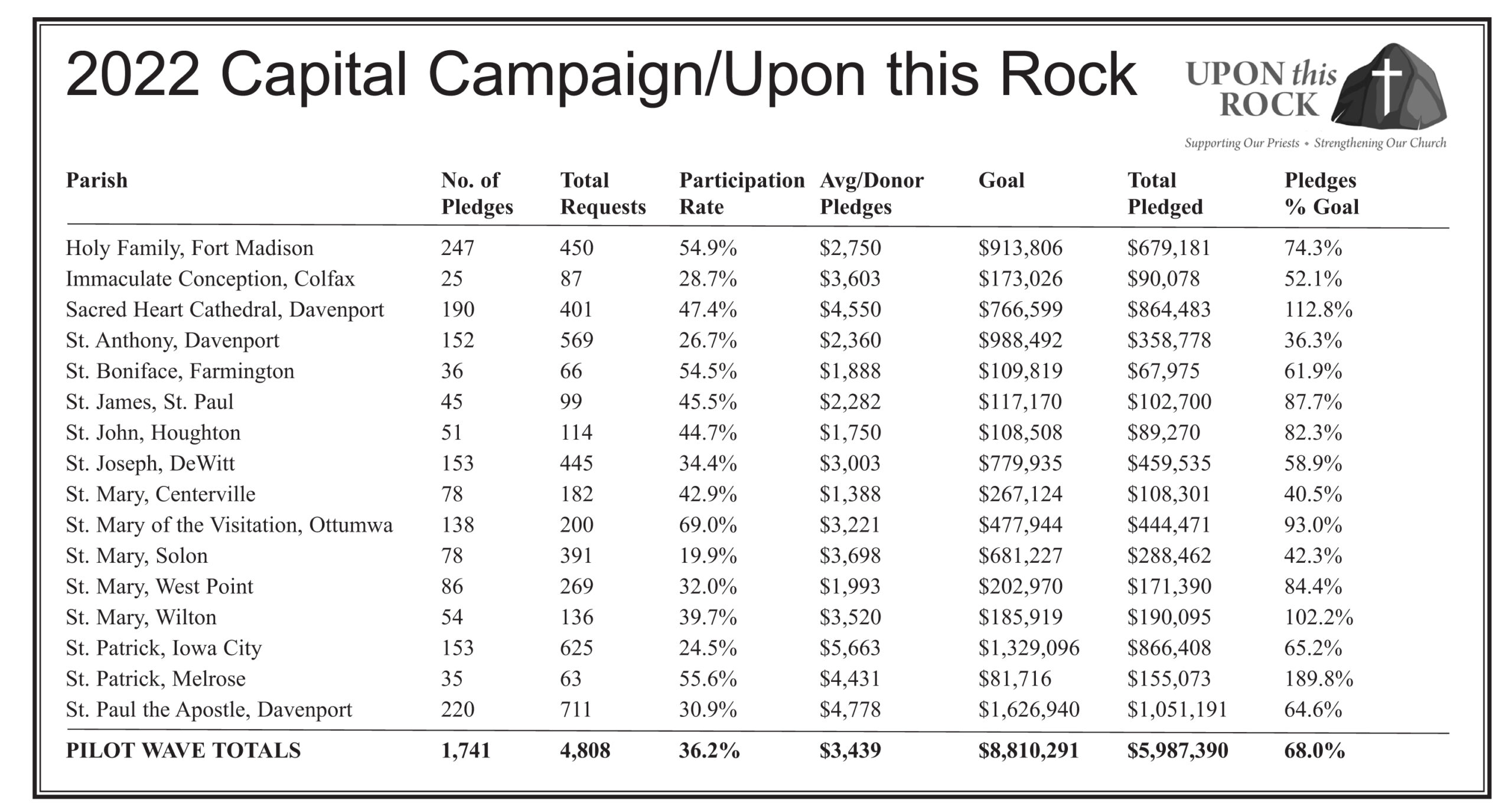 People are stepping up to support priests in their retirement, the education of seminarians, and their own parishes through the Diocese of Davenport’s Upon This Rock capital campaign. The pilot wave of 16 parishes is winding down and the second of three waves starts this fall.