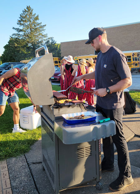 Fast forward to Sept. 9, when Father Rauenbuehler hosted the second of five tailgate parties. He had help from Abbey Heinrichs, coordinator of youth ministry for Our Lady of Victory. They set up a cornhole (beanbag toss) game, turned on the music and set out snack foods. The priest grilled hamburgers, cheeseburgers and hot dogs. Heinrichs also helps find funding for the food and volunteer help as needed.