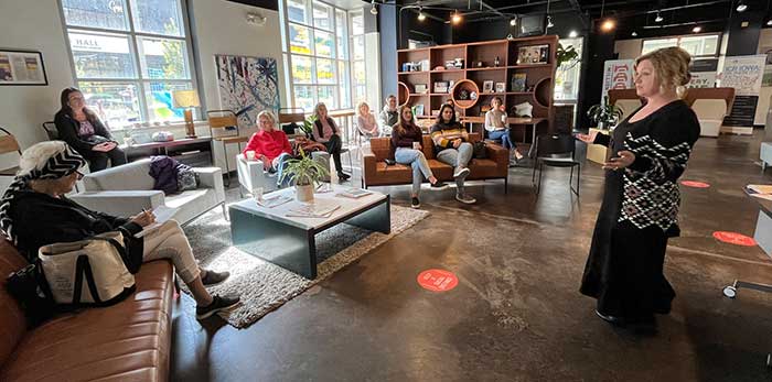Author Leah Jacobson speaks to a group at MERGE in the Iowa City ped-mall earlier this month.
