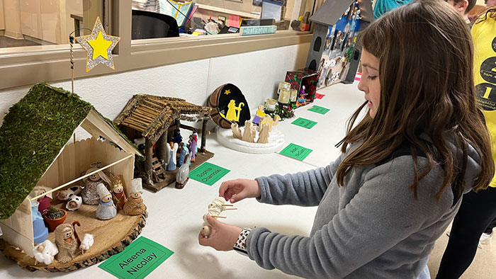 In addition to creating a nativity scene, students write an original Nativity story in their language arts class, currently taught by Demi Franck. “For the story, the main focus is the message that God sent his son to save us from our sins,” Franck explained. “Some students write poems, create digital storytelling, write a dramatization or create a diary entry. The various formats allow the kids to incorporate their own creativity and personalize their version of the Nativity story.”