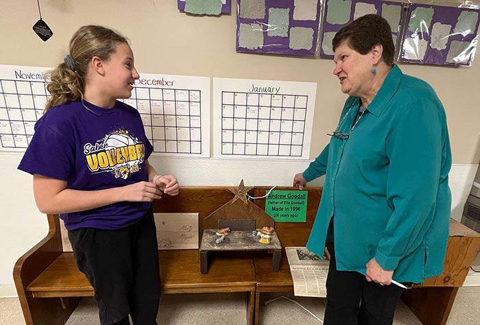Lola Blaser, right, a religion teacher at St. Joseph Catholic School in DeWitt, shows sixth-grader Ella Goodall the nativity scene her father, Andrew Goodall, made as a student at the school in 1996.
