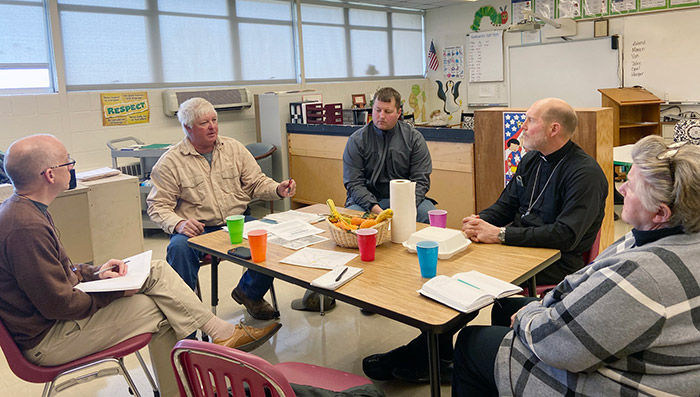 Bishop Thomas Zinkula listens as farmer Ray Menke talks about his concerns regarding the safety of a proposed CO2 pipeline that would run through Lee County, Iowa, including on his farm near West Point. Seated next to him (right) is farmer Dan Steffensmeier. Others listening are Lynne Devaney, diocesan superintendent of schools and Deacon Kent Ferris, diocesan director of Social Action. The meeting took place Nov. 22 at St. Vincent School in Keokuk.