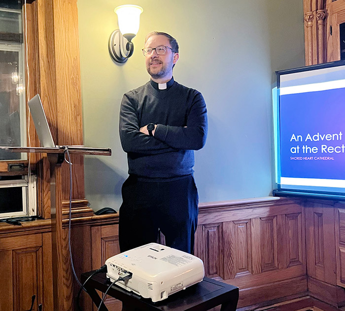 Surrounded by holiday lights and a warm fire in the rectory of Sacred Heart Cathedral in Davenport, Father Thom Hennen, the pastor, shared the history of Advent with parishioners. Twenty-eight people squeezed into the dining area on Dec. 1 to hear his presentation.