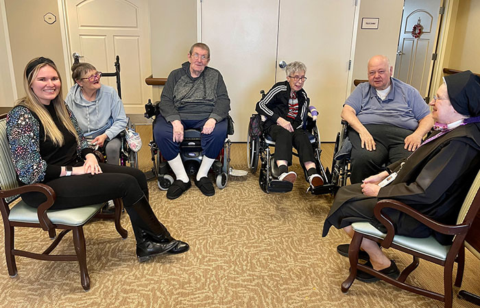 Social worker Julie Erickson asked residents of the Kahl Home in Davenport what advice they would give to their 30-year-old selves. Pictured from left, are Erickson with some of the residents, Patsy McIntosh, Father Robert Busher, Betty Harland, Terry Ceurvost, along Sister Lois Baniewicz, director of mission integration.