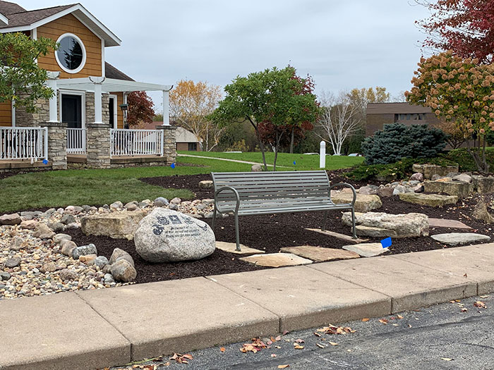 The landscape company “was incredibly helpful in the planning process.” Gassen sought to provide a low-maintenance landscape. “We created plans for a dry riverbed. With the encouragement of my parents, I decided to have a commemoration to the military branches (as part of the project). In particular my uncle John who was a Marine Corp veteran had died recently at the Hospice House.”