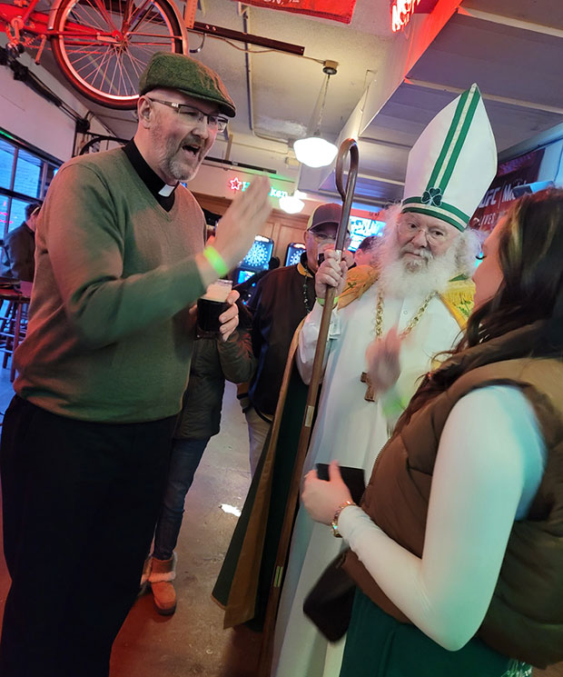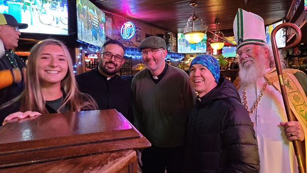 Each year, Dan Daly of St. Patrick Parish dresses up as St. Patrick and goes downtown on his feast day to evangelize. This year, he was joined by pastor Father Troy Richmond, former pastor Father Joseph Sia, Deacon Angel Hernandez and a group of parishioners. The group went to several bars to take selfies, meet people, offer blessings, talk about the faith and invite them to Mass.
