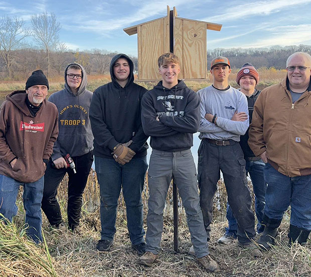 Logan Hamma, center, recently built 10 Wood Duck houses in Hancock County, Illinois en route to earning the rank of Eagle Scout. From left, Tom Schaefer, Jordan Cooper, Cole Norton, Isaac DuCharme, Austin Cooper and Cory Hamma helped Logan build the duck houses.