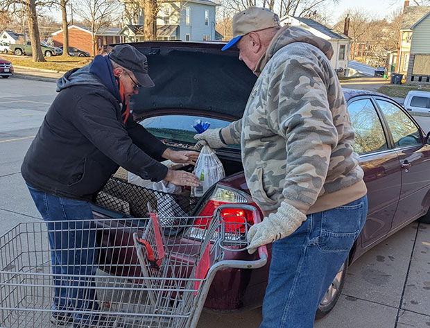 Mark Baxter and Don Kuechmann of Divine Mercy Parish-Burlington/West Burlington volunteer at St. Vincent de Paul Food Pantry in Burlington in 2021.